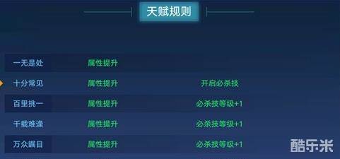 天赋提升是可以增加精灵六个维度的属性(生命、物攻、物防、魔攻、魔防、速度),天赋等级有以下这些一无是处、十分常见、百里挑一、千载难逢、万众瞩目、王者无敌、天下无双。除一无是处与天下无双天赋以外,将会有必杀技的开启与提升。