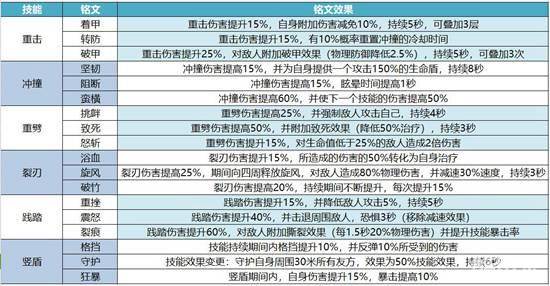 职业铭文是从角色等级20级开启,等级每升5级会开启1列铭文,需要完成达到相应等级后完成主线任务才可完开启,建议铭文配置围绕着其角色定位来走比较适合日常的活动。以下为战士所有技能的铭文效果: