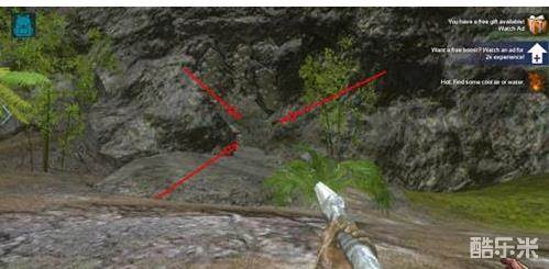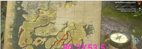 猎手神器位于地图南侧,坐标80.2X53.5,,地图是无法显示坐标的,我们只能根据周围环境参考,地图一条峡谷很明显,洞口位于一个峡谷的一侧,咱们可以从箭头方向过来,那么洞口就是在右侧,仔细找找即可。
