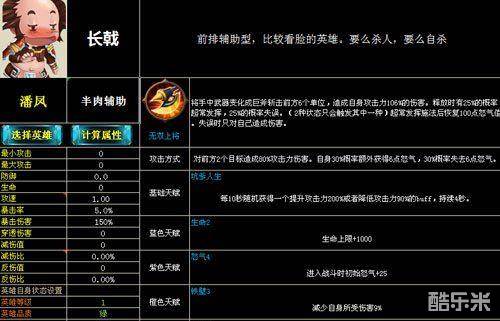 潘凤作为前排辅助,其技能比较看脸,运气好超常发挥能开始恢复怒气值并造成高伤害,运气不好那就那等于在自杀啊,不过他的天赋坑爹人生每10秒随机获得一个提升攻击力200%或者降低攻击力90%的buff,持续4秒,还是有点用的。