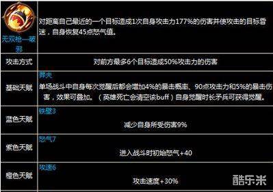 技能和天赋分析:这个武将的技能单体输出很恐怖,而且每次觉醒技能后都会增加自身攻击力,暴击概率和暴击伤害,放在前排输出再好不过,除此之外他在前排吸收伤害,当自身血量降到20%时还会触发暴怒天赋,减伤并免疫负面状态,再次提高暴击几率和暴击伤害,简直无情。