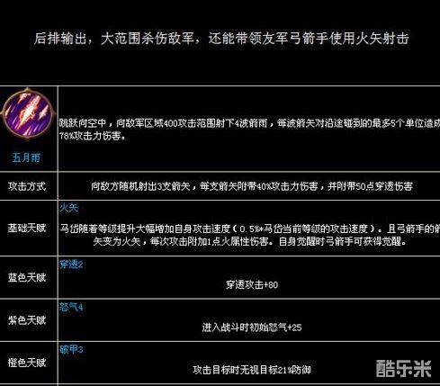 游戏中马岱是后排输出型武将,武器是弓箭,普通攻击附带穿透伤害,能大范围杀伤敌军,而且解锁武将天赋后射出的箭矢会变成火矢,再次附带火属性伤害,自身攻击速度也会的到提升,其输出能力堪称恐怖,不信的话就一起来看看他的武将技能和天赋吧。