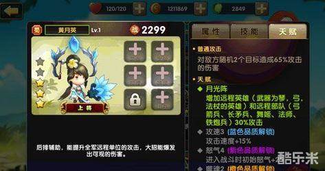 基础天赋:月光阵,增加远程英雄(武器类型为琴、弓、法杖的英雄)和远程部队(弓箭兵、长矛兵、舞姬、法师、铁炮兵)30%攻击力。