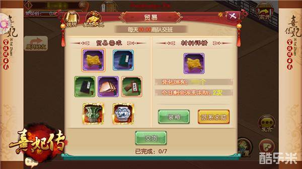 前来拜访小主家园的不只有邻居们。每日零点之时,家园门口还会将迎来一群商队。商队提出7件贸易需求,小主们若有对应的物资可装箱交给商队,根据装箱物件的稀有程度换取不同的报酬奖励。一天时限内,全部装箱完成即可交货,获取最终的交货奖励。