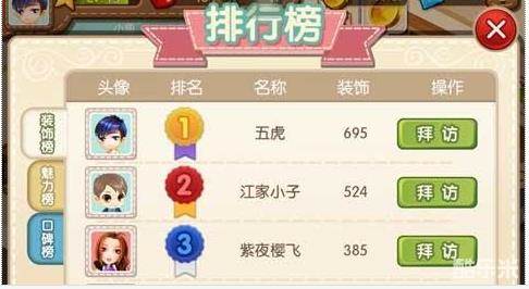 至于装饰榜的话是看玩家的装饰值的大小来排序的,很遗憾的是小编才刚刚开始玩几天还未能入榜,其次是魅力榜,玩家初始进入游戏时会有10朵玫瑰花代表10点魅力。玫瑰花可以在玩家间相互赠送的。魅力榜是根据玩家玫瑰花的数量决定的。小编也是在游戏中认识很少朋友的。