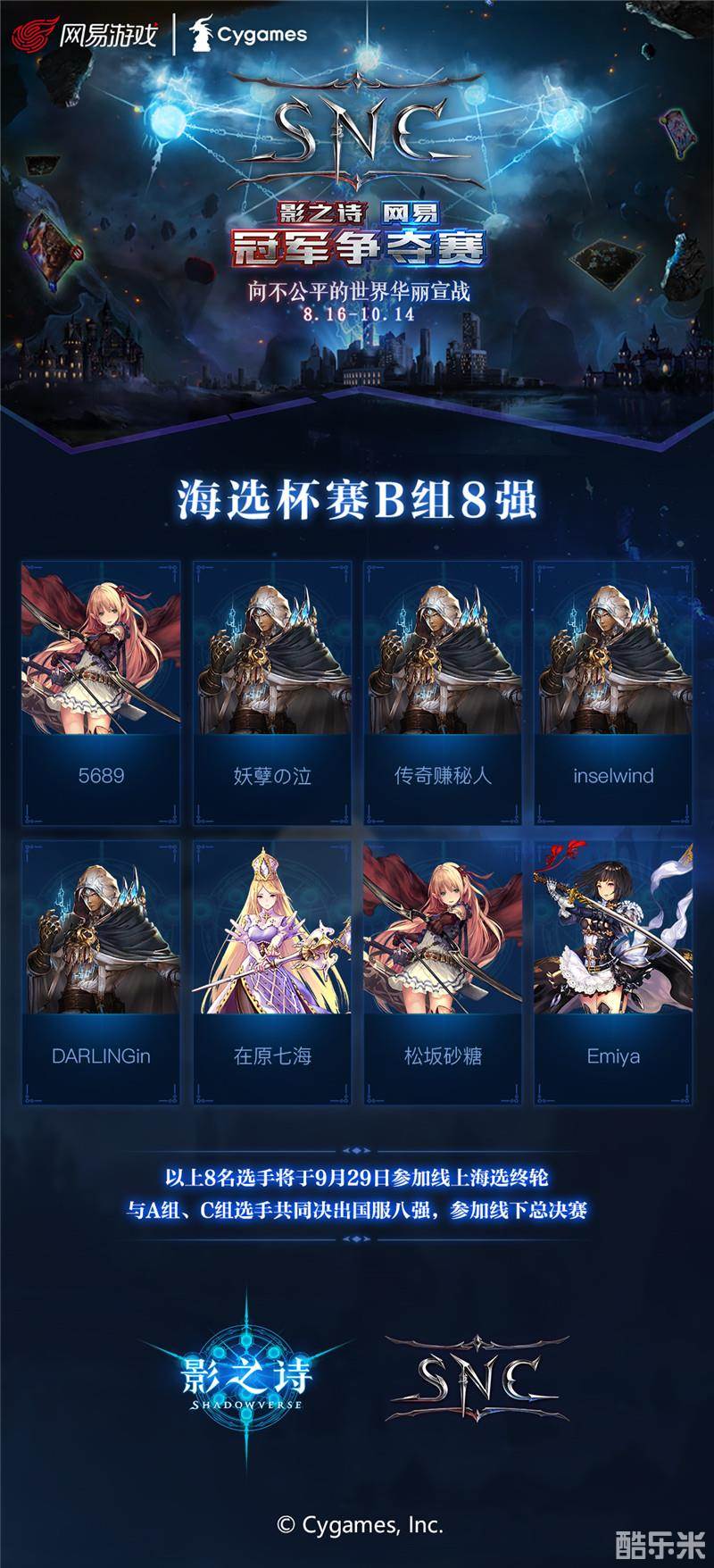 “向不公平的世界华丽宣战!”《影之诗》网易冠军争夺赛(Shadowverse NetEase Championship,简称SNC)海选杯赛B组比赛已于9月9日圆满结束。最终, 松坂砂糖、在原七海、妖孽の泣等8名玩家率先从广大参赛者中脱颖而出,晋级到线上海选终轮比赛中,将在9月29日继续较量牌技,和A组、C组的晋级选手一同冲击国服八强的宝座!