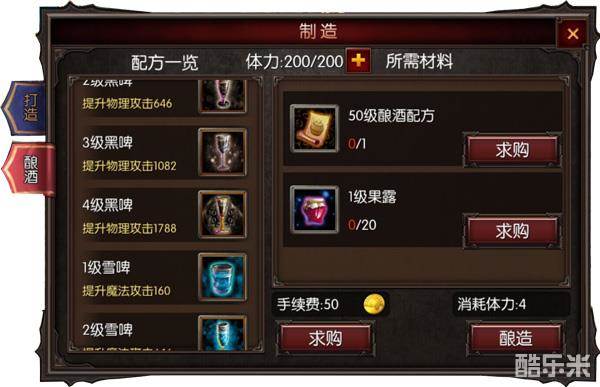 收集齐材料后,就可以开始酿酒了。当然如果打造材料是绑定的话,酒品也是绑定的。制造物品需要消耗体力。体力用光也不用担心,因为会随着时间恢复,回到主城君临恢复速度最快哦,当然也可以直接购买体力。