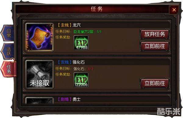 完成可获得大量经验、金币、宝石、装备、精炼石、强化石,以及各种商城道具,是提升等级、战力一个必不可少的途径。