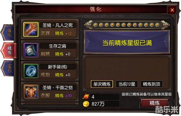 3、精炼:武器、裤子精炼,其他放一边;精炼花费也很大。