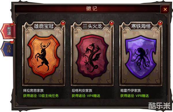 6、徽记:每个徽记都有注明获得途径,徽记法阵提升战力则选择攻击为先,搭配十分重要。前期很容易获得雄鹿宝冠、黄金狮子、太阳金矛及冰原狼