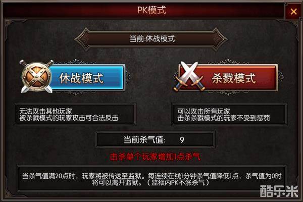 其实是游戏设置了玩家野外pk玩法。所有玩家在野外刷怪做任务时,可设置休战模式和杀戮模式。设置杀戮模式时会攻击所有玩家,每击杀一个玩家都会累计1点杀气,当杀气满20点时,会被传送至监狱。