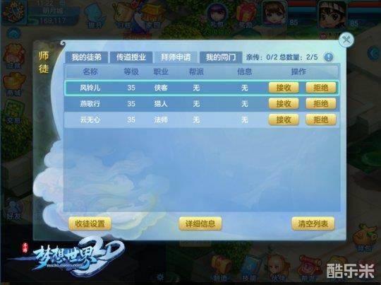 梦想世界,江湖之大,想要找到一个合适的师傅或者徒弟又谈何容易!不过不用担心,《梦想世界3D》师徒系统装备了完善的拜师收徒体系!每位想要成为师傅的玩家均可在收徒界面设置收徒意愿,设置成功后系统自动发布广告到拜师界面,徒弟们看到广告申请拜师,师傅在“拜师申请”界面筛选同意,即可迅速建立师徒关系!