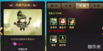 需要注意的是兵种的克制,就比如说弓箭兵打骑兵的伤害就是要低很多,而对面也有很多其骑兵时,不管你弓箭兵比长矛兵高多少级也要狂出长矛兵,5级弓箭兵对骑兵的伤害甚至不如1星长矛兵。再比如说投石车基本上是所有小兵的爸爸,那就可以走全刀盾兵硬吃伤害来帮助武将收割的打法。