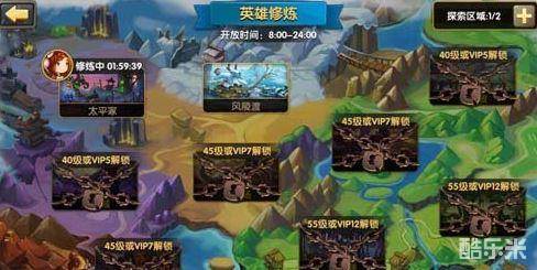 英雄修炼中共有9个修炼场所,会随着玩家等级的提升逐渐开放,不同的修炼场所可以获得的奖励各有不同,玩家可以根据自己目前最需要哪种资源来挑选,2个小时修炼一次,只要坚持下来收获还是颇丰的,不过需要注意的是非VIP玩家一次只能同时派遣两个武将进行修炼,想要多探索几个区域就需要更高的VIP等级了。