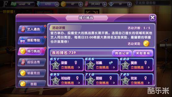 我们在排行挑战的活动里可以看到每天会有5次免费的机会,自己当前的排名、挑战记录和奖励查询还有下面的玩家(我们要挑战的对手~~)。