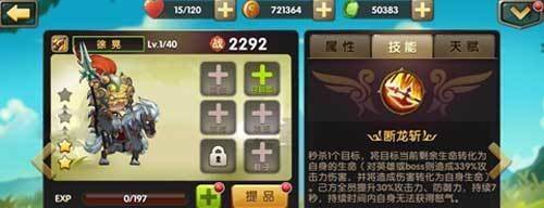 徐晃技能:断龙斩,秒杀敌方一个单位,并且将目标当前剩余生命值转化为对自身的生命,对英雄或boss则造成基础攻击力339%的伤害,造成的伤害值转化为自身生命值。如果对象是英雄时无视目标60%防御,己方全员提升30%攻击力、防御力。持续7秒。Buff持续时间类徐晃无法获得怒气值。