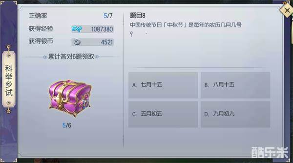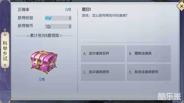 4、累计答对6题可以领取科举乡试宝箱,宝箱将以邮件的形式发送到各位学子的邮箱,请注意查收;