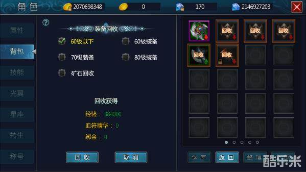 在平常打怪升级当中,不需要的装备可以通过回收功能转化为海量经验、绑金,高等级