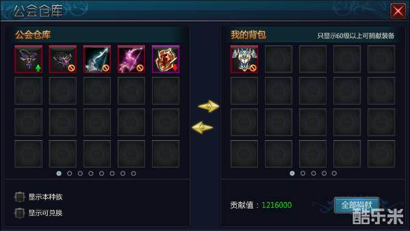 你可以将你用不到的装备放入公会仓库中以兑换贡献值,通过贡献值可以在行会仓库中兑换你喜欢的装备