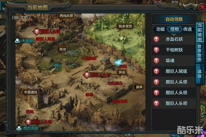 阪泉(23-25级):赤血石妖22级、吸魂23级、干枯树妖24级、勾魂恶鬼25级、酣巨人贼寇25级、酣巨人头领(BOSS)