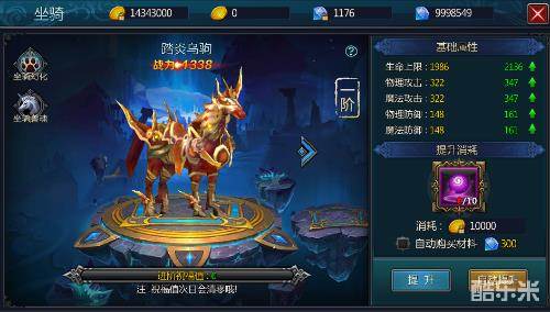 坐骑提升需要消耗坐骑进阶丹,坐骑进阶丹可以通过各种活动、礼包、商城购买等方式获得。
