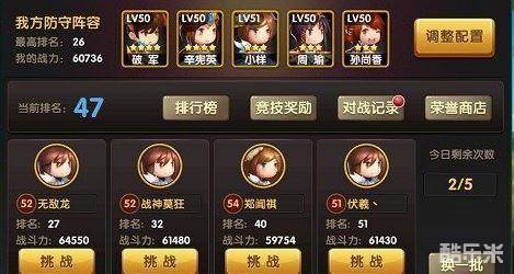玩家可以在主界面的排行榜查询自己的竞技场排名,这里的排名是按照玩家的防守战斗力来排的。还可以看到自己的排名上升和下降情况。竞技场前三的玩家会分别获得巅峰的竞技王者、一骑当千、所向披靡的称号。