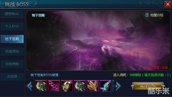 地下宫殿可在崎天城神官护卫处或者点击主界面右上方的“BOSS”图标进入,进入需要消耗500绑钻,每天前3次可免费进入。