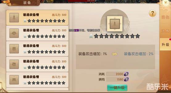 用道具提升装备等级增加大量战力,需要消耗一定量的强化石和银两,强化的等级越高需要的强化石属性也就越多。强化的等级不能超过装备的自身等级。