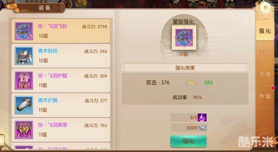 强化人物装备,提升战力;消耗一定数量的强化石强化装备,成功率百分百,装备星级越高,消耗的强化石也就越多。最高可以升到30级,强化到一定条件有额外属性加成。