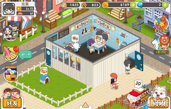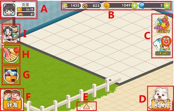 点击主菜单后,将弹出游戏的5个主要操作按钮:进入物品商店、进入物品仓库、进入物品摆放模式、进入人物装扮商店、进入狗狗信息界面。
