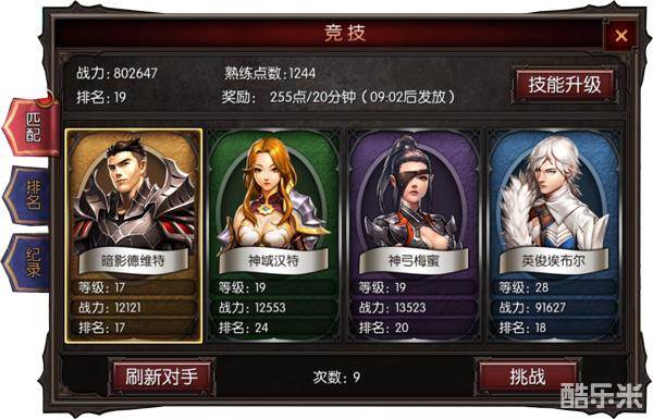 游戏主界面可以直接进入竞技,玩家初始时排名很靠后,进入挑战时系统会随机匹配排名相近的对手。选定要挑战的对手,点击挑战即可进入到新场景进行对战,大家也可使用刷新对手功能更换对手。挑战胜利后可替代其排名并且获得奖励。另外奖励每隔20分钟发放一次,玩家同样会获得技能熟练点数,技能熟练点数是升级主角技能必备的哦!