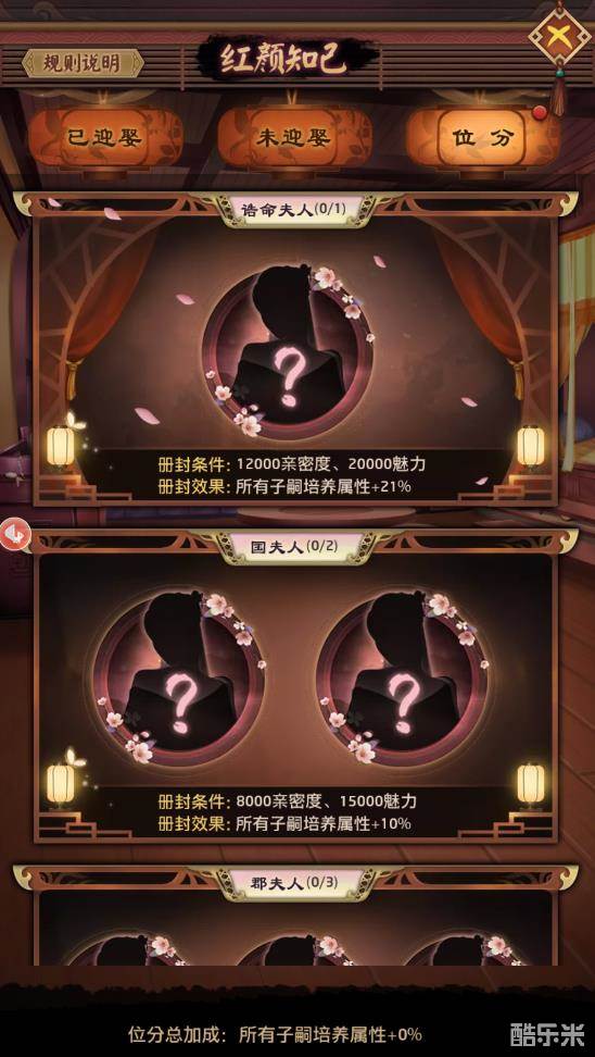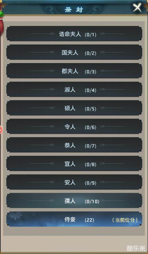 在红颜知己玩法中,红颜的亲密度、魅力值每达到一定要求,就可以册封更高的位分。分别为侍妾、孺人、安人、宜人、恭人、令人、硕人、淑人、郡夫人、国夫人、诰命夫人。