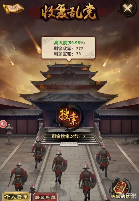 如果遇到了强大的乱党,也可以寻求联盟其他玩家的帮助,所有搜索到的乱党都是全盟同享的。注意玩家角色官品越高,搜索次数上限就越高,冷却时间也越短哦。
