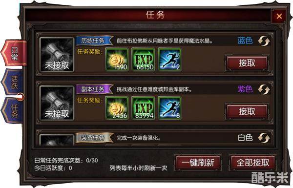 少于10个小时的玩家可以把每天3次徽记、5次许愿、10次侍从免费获得次数留着,先到日常任务界面把这3个任务刷新颜色到橙色接取就能获得可观的奖励了。还可以获得活跃度(活跃度达到一定数值则可以领取当日活跃奖励,次日不累计,所以大家完成活跃度要求后记得领取哦)每日可完成30次。