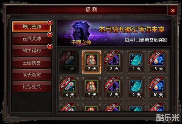 签到好礼送不停哟,第5天、10天、15天、20天、25天、30天都是钻石赠送哟,而且VIP领取的是双倍钻石。
