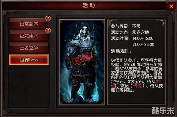 组队参加世界boss,排名前列有机会获得三级宝石。