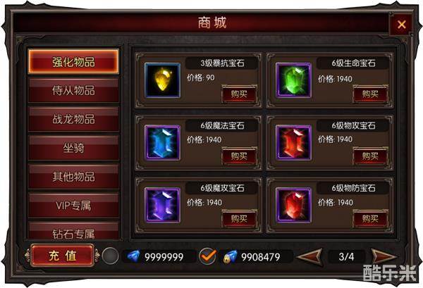 获取宝石的最直接来源就是商城购买,商城能购买到的宝石有3级的宝石以及6级的宝石,价格分别为90钻和1940钻。