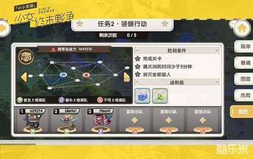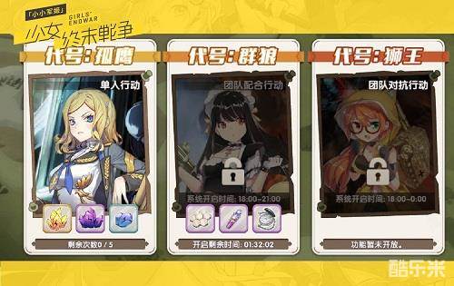 《小小军姬》的特攻玩法共有“孤鹰”“群狼”“狮王”三种,分别为单人行动、团队配合、团队对抗PK,除了人数和对抗方式上的细微差别,主要玩法都是编队作战,匹配对决,以“孤鹰”为例,司令官达到一定等级后,即可开启任务,每个任务分为“简单”“普通”“困难”“危险”“疯狂”五个难度,每个难度三星通关后集满星数可开启宝箱,获取能源晶石等装备精炼材料。