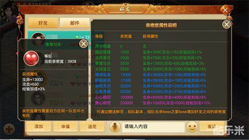 通常来说,社交由两个部分组成,其中之一是社交功能,包括了好友栏、文字系统、语音系统等,其搭建了游戏社交的基础,类似现实生活中的电话、信件等。好友栏作为最简单的社交功能,仙豆手游《剑逆八荒》中除了常规的添加好友、好友聊天的基本功能,还新增了显示与好友间的亲密度。在亲密度达到不同的等级,共同组队会有属性增益效果。《剑逆八荒》通过进一步强化社交功能,鼓励深度互动社交,增加了玩家之间的情感互动,也有助于提高玩家的黏性。