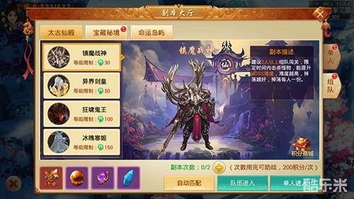 除了仙缘副本,仙豆手游《剑逆八荒》中几乎没有必须组队才能完成的活动或任务。网游通常有一些要求多人组队才能进去的任务,由于玩家的碎片时间难以重合,经常导致“组队2小时,任务5分钟”的尴尬。装备副本(太谷仙殿)是最常进入的副本,但游戏没有强制要求组队进入。只要个人实力足够通关,单人亦可!此外,任务完成后继续进入也会得到积分奖励。