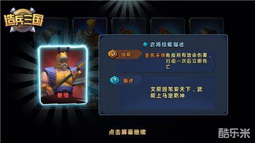 姜维可谓文武双全!在游戏里,姜维可谓不死不休,鞠躬尽瘁。技能至死不休免疫所有致命伤害,但行动一次后立即死亡。不死的姜维可厉害了,如果这场战斗对你至关重要,且对方实力强于你,那么利用姜维很有可能让你逆风翻盘,起死回生!