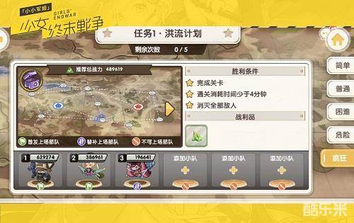 《小小军姬》的特攻玩法共有“孤鹰”“群狼”“狮王”三种,分别为单人行动、团队配合、团队对抗PK,除了人数和对抗方式上的细微差别,主要玩法都是编队作战,匹配对决,以“孤鹰”为例,司令官达到一定等级后,即可开启任务,每个任务分为“简单”“普通”“困难”“危险”“疯狂”五个难度,每个难度三星通关后集满星数可开启宝箱,获取能源晶石等装备精炼材料。