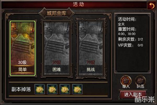《冰火传奇》中的城邦金库一天2次个人副本,以及2次的组队副本,如果你有VIP还能多1-3次。城邦金库分为普通、困难、挑战,玩家可以根据自己的战斗力高低选择难度进行挑战。当然首先你要达到30级哦。难度越高,获得的奖励也就越好了。你可以带着你的伙伴组队pk,也可以自己单枪匹马挑战。缺钱花,来城邦金库就对了,这里有大量的金币等你来拿,你还在等什么,赶紧挑战吧!