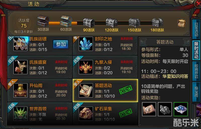 答题活动是一个单人参与的活动玩法,在等级30级以上开启,每天的11:00-23:00期间通过活动界面参加答题。题目主要以华夏知识问答为主,都是涉及到游戏中的一些简单的玩法,一共有10道问题,每道题都有充裕的答题时间,完成10道答题后会奖励10点活跃值。