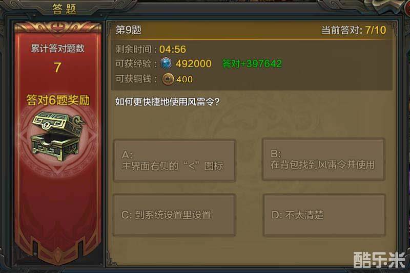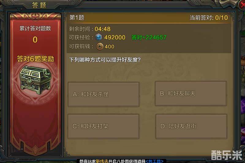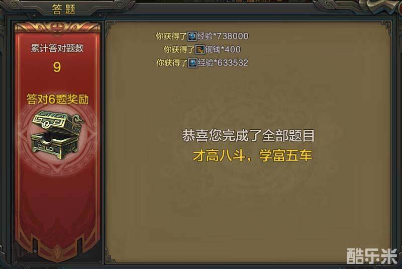 答题活动的题目非常简单,只要了解游戏中的一些基础玩法,想要答对6道题、或者是10道全对,还是很容易做到的,而想要拿到更多的经验奖励,则尽量答对更多的题目。