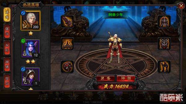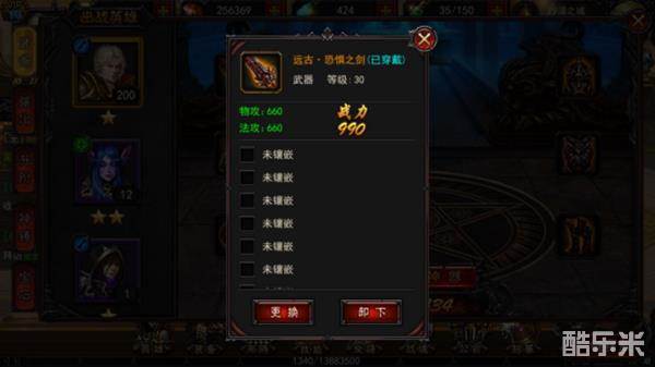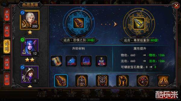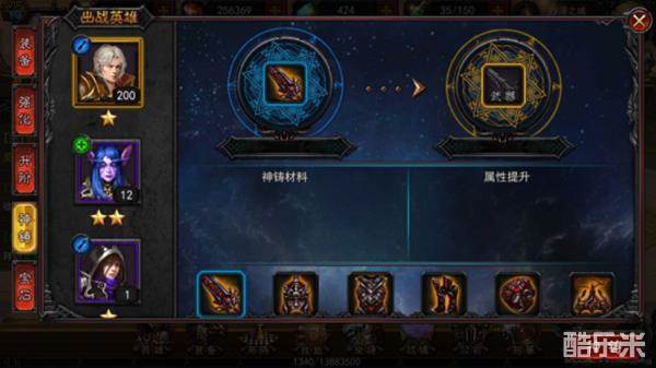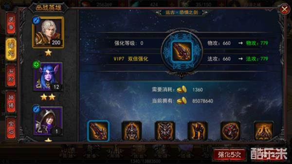 装备:打开装备界面,可以给英雄穿戴、卸下装备;还可以进行装备强化、装备升阶、装备神铸操作