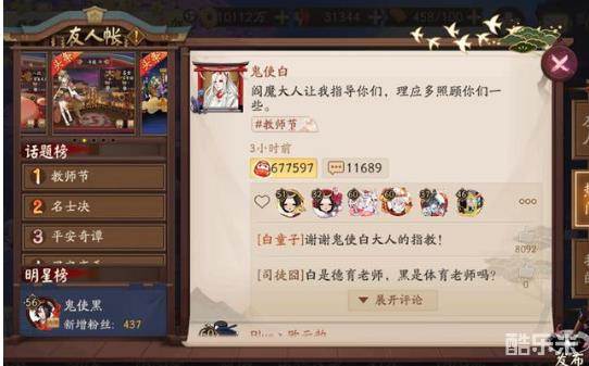 进入界面后我们能发现作为游戏中NPC的存在,鬼使白发布了有关教师节的话题消息,通过点击红蛋可以自动为鬼使白的话题点赞,然后获得奖励,值得注意的是奖励是随机不固定的,什么奖励都有可能,脸黑的可能获得红蛋这种不值钱的奖励,不过对于欧洲人来说,只要脸白就能获得蓝票。
