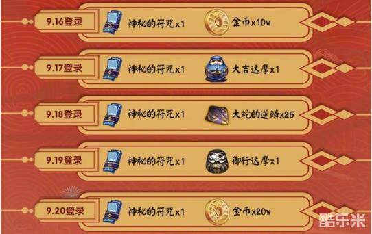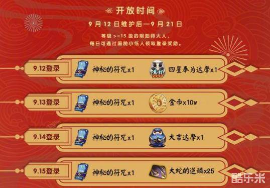 本次奖励将于9月12日维护之后到9月21日开启,只要等级高于等级15级每天登陆就可以领取,也就是说过两天正式服就进入了周年庆的庆祝时刻,不过白藏主和少羽大天狗预计还要在体验服停留一周才会在正式服开启卡池活动,这次算是周年庆的一个预热活动吧。