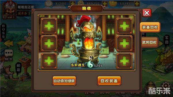 玩家可以将不需要的装备、亦或是过度装备、还有不使用的武将进行资源回收。回收后会产出一定的铜币、经验丹、魂玉等。当然,进行回收的品质越高,所产出的回报就越丰盛。每次回收最多可以放入6件物品,回收系统默认常规设置为绿色武将、蓝色武将,绿色装备、玩家可以自行选择回收更高品质的物品。