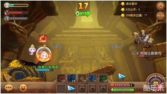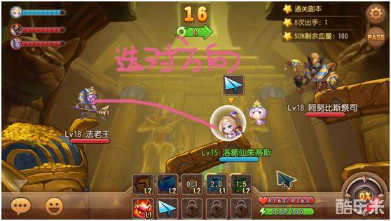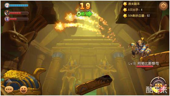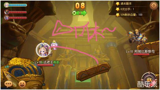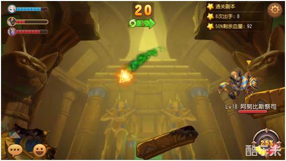 分析该地图,通关并不困难,左边精英怪的血量相比右边boss要少一些,那么优先打精英怪也是一种可以减少伤害的方式,在自己的有效攻击分配合理的情况下,8次出手解决战斗也不是什么难事,关键在于,两个怪物的攻击力都较高,在2V1的情况下,8个回合意味着血量过半是件比较难以完成的事情。